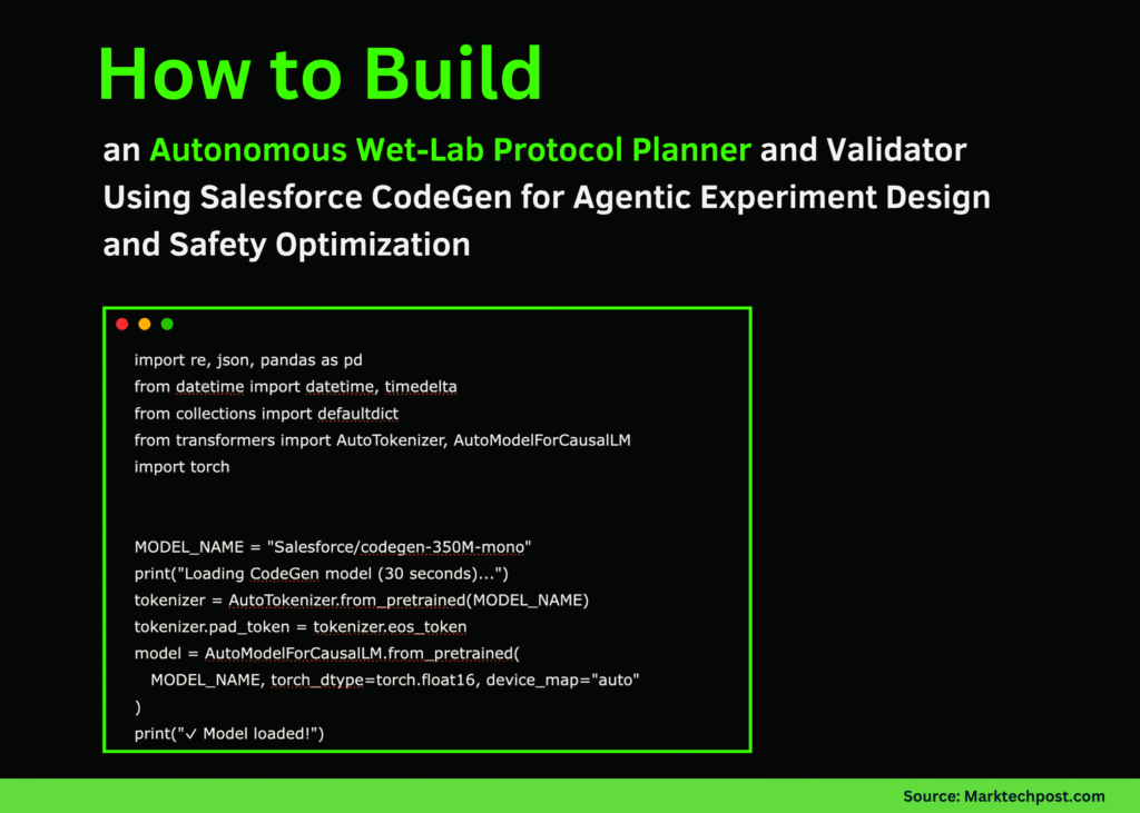 En este tutorial, creamos un planificador y validador de protocolos Wet-Lab que actúa como un agente inteligente para el diseño y la ejecución experimentales. Diseñamos el sistema usando Python e integramos Maniquí CodeGen-350M-mono de Salesforce para el razonamiento en habla natural. Estructuramos la canalización en componentes modulares: ProtocolParser para extraer datos estructurados, como pasos, duraciones […]